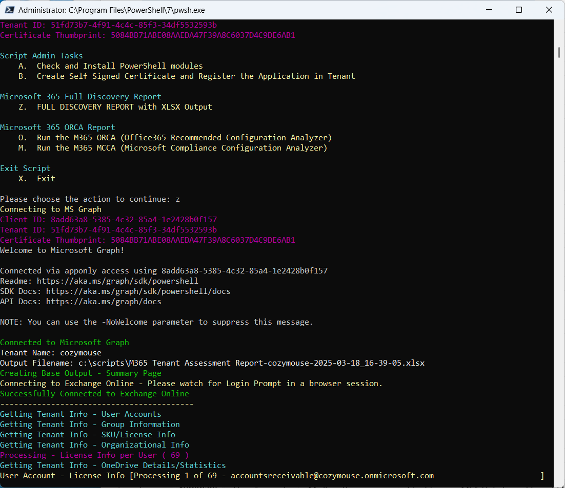 Completely re-written recently to remove the need for the PowerShell modules for PNP Online, SharePoint, Teams. As it now uses MsGraph extensively. The Application Registration and certificates are now fully created in the script making the setup of the data collection incredibly simple and easy. As it uses Graph now, the speed is also massively better than ever before. Also no more excessive login requests with the SPO/PNP modules for constant connections. You can now kick off the script, connect to a single prompt with EXO then walk away and leave it to run completely. Even the connection XML is updated completely by the script itself.
